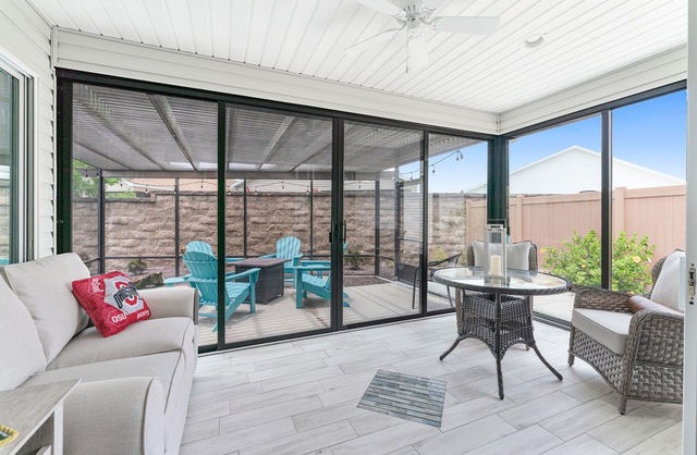 • Spacious living room with vaulted ceilings and stacked sliding doors leading to a beautiful Florida room, offering a comfortable four-season retreat